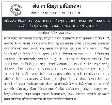 काठमाण्डौ । नेपाल विद्युत प्राधिकरणले डेडिकेटेड फिडर र ट्रङ्कलाइनमार्फत विद्युत् उपभोग गरेका तर अहिलेसम्म भुक्तानी नगरेका उद्योगीलाई बक्यौता बुझाउन आउँदो कात्तिक १७ सम्मको समय दिएको छ । २०७२ साल माघदेखि २०७५ वैशाखसम्मको बक्यौता विद्युत् महशुल भुक्तानी गर्न प्राधिकरणले निर्देशन दिएको हो ।
